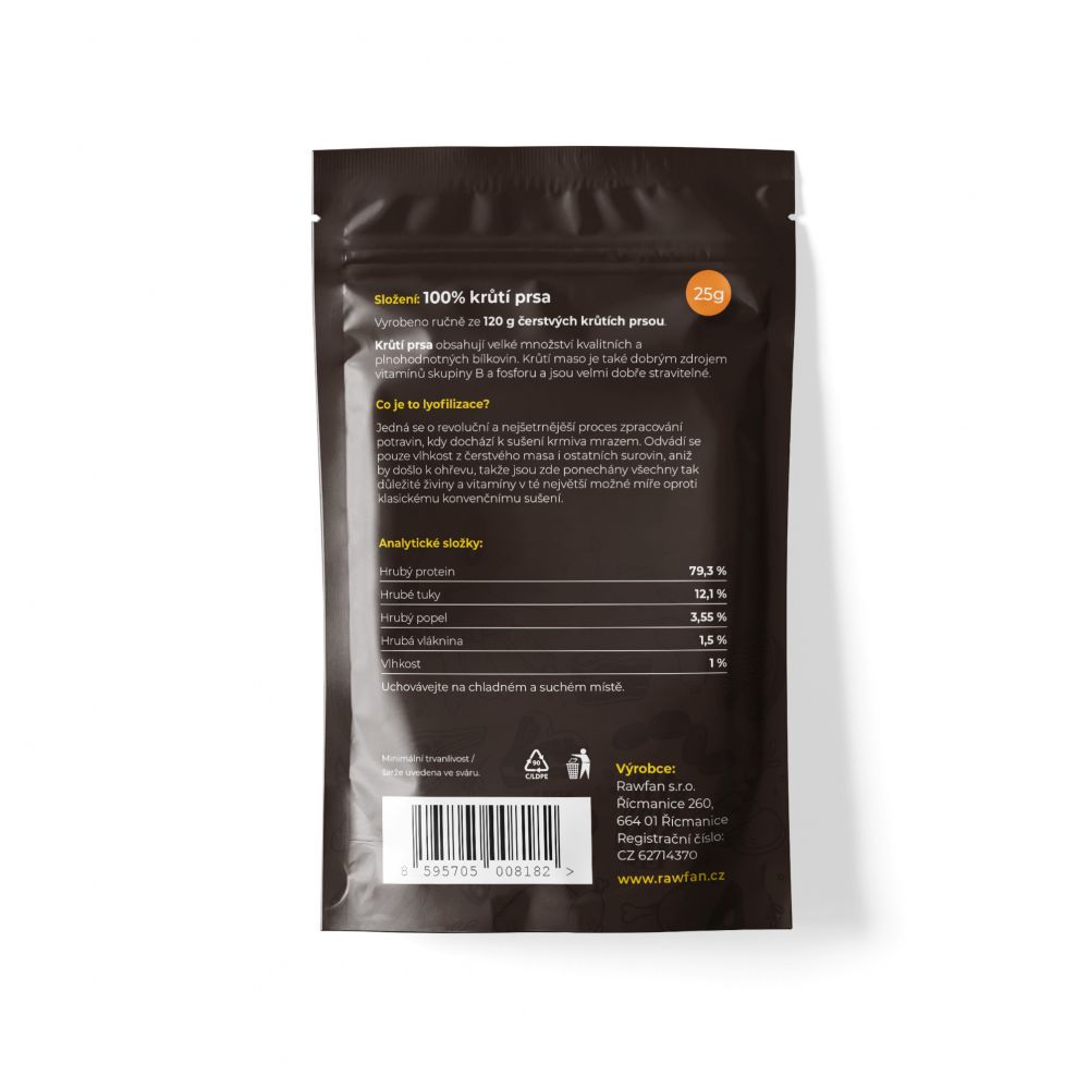 K výrobě 25 g lyofilizovaného krůtího masa bylo použito 120 g syrového krůtího masa.