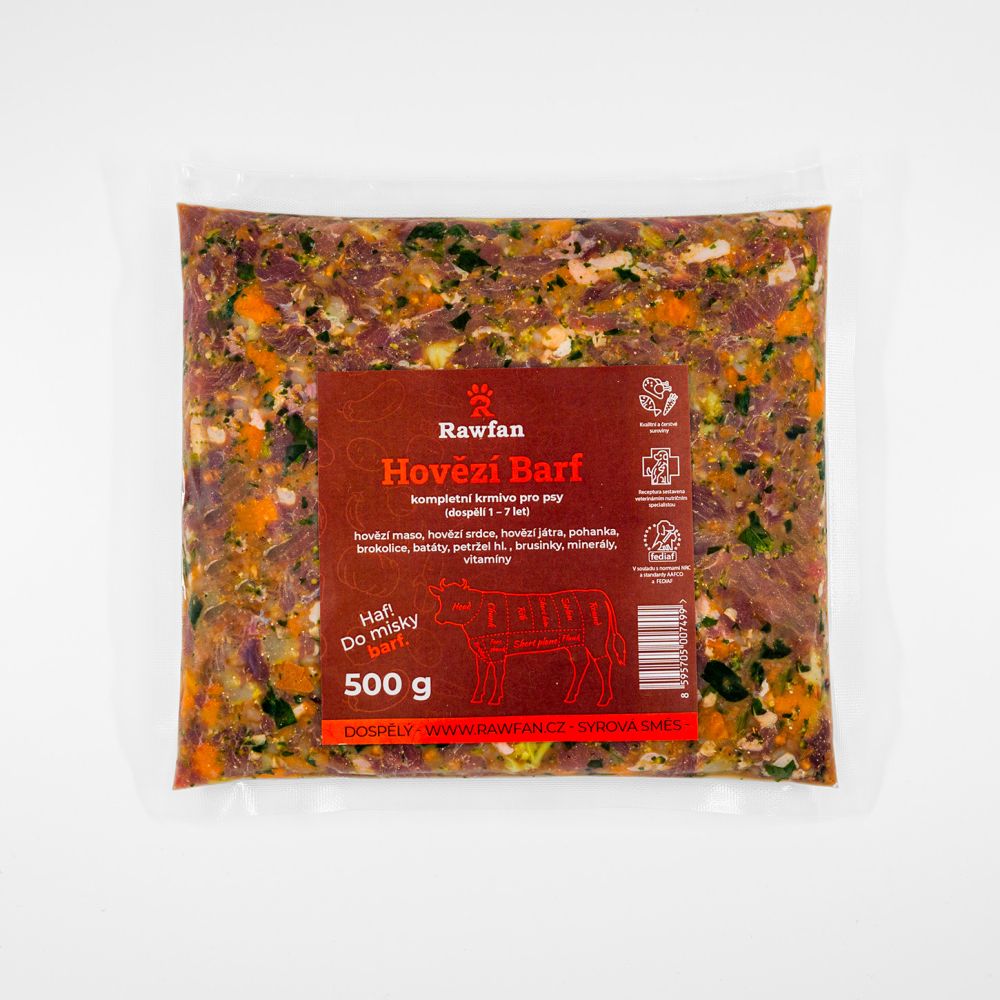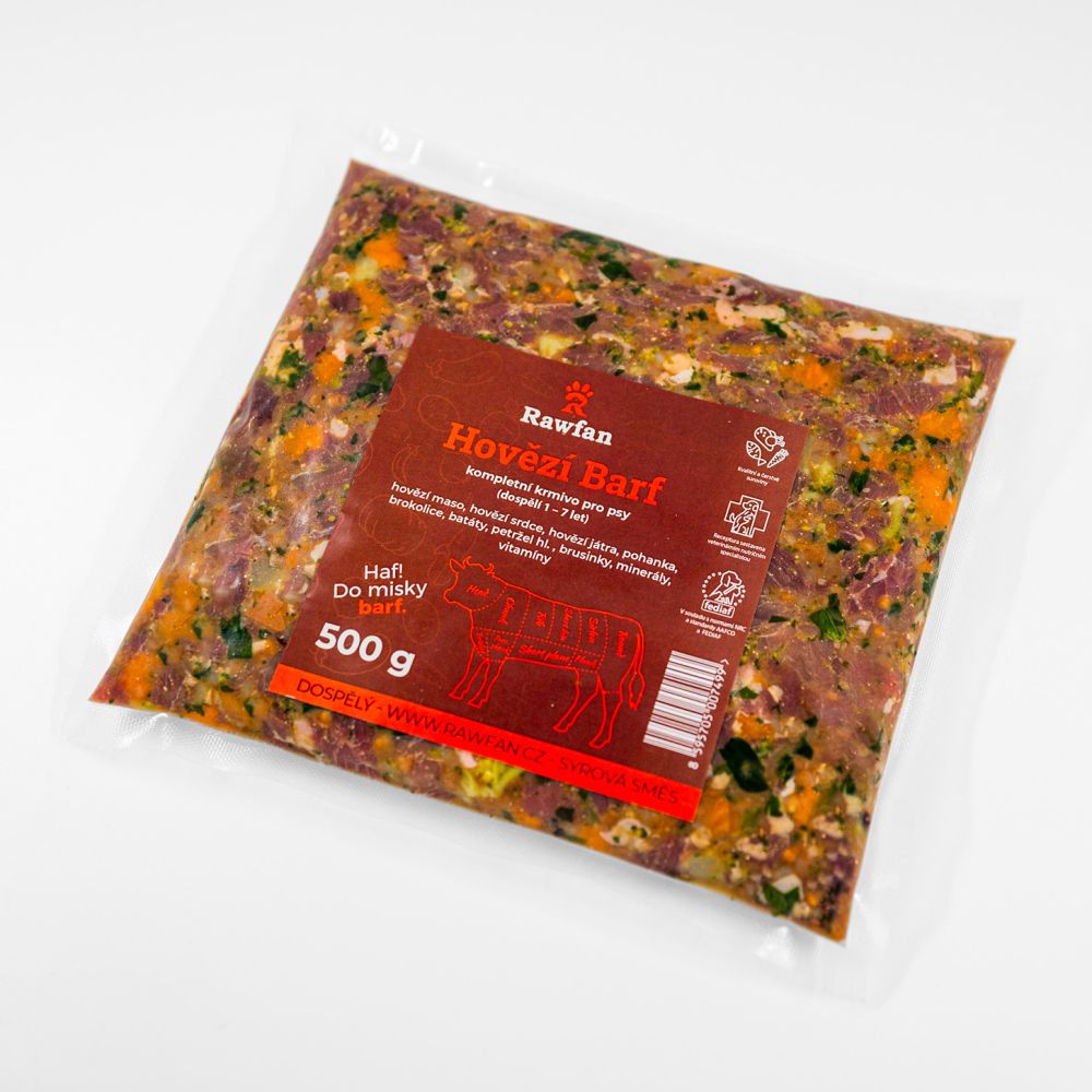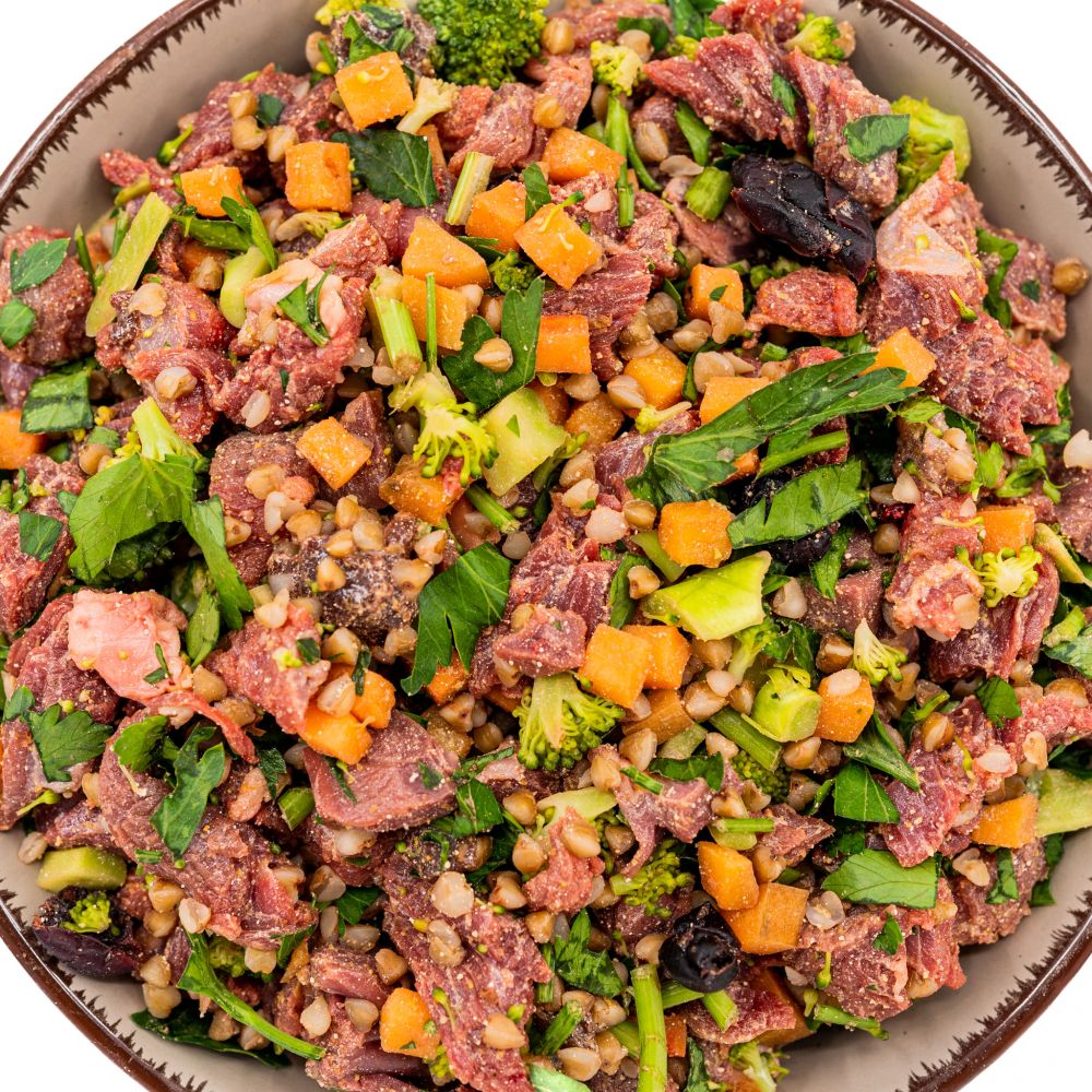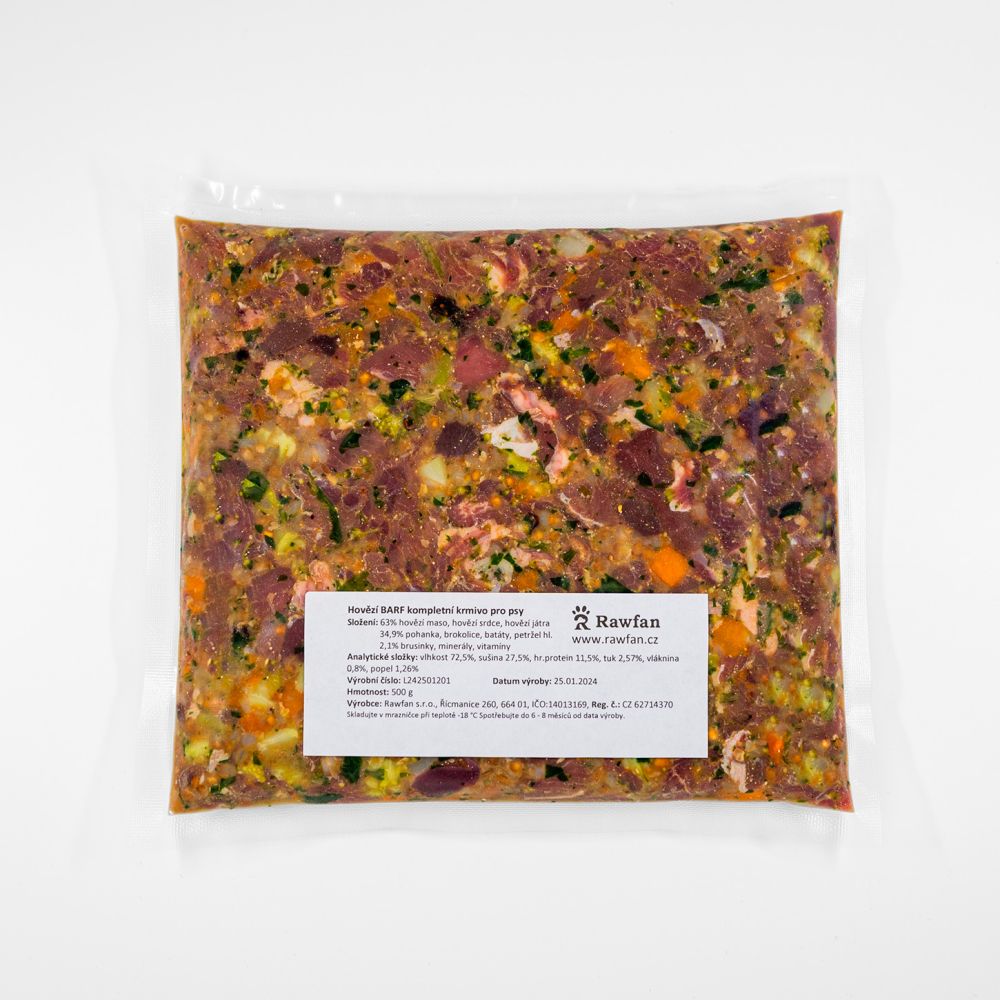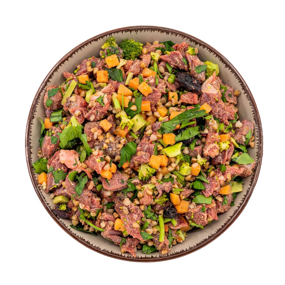Hovězí směs je vyrobena z čerstvého hovězího masa, hovězích srdcí a jater, pohanky, brokolice, batátů, hladkolisté petržele, sušených brusinek a rybího oleje, doplněné o potřebné vitamíny a minerální látky, pro podporu kostí, zubů, svalů, zdravou srst a pro správné fungování organismu. 100% vyvážená strava té nejvyšší kvality pro opravdové psí labužníky.