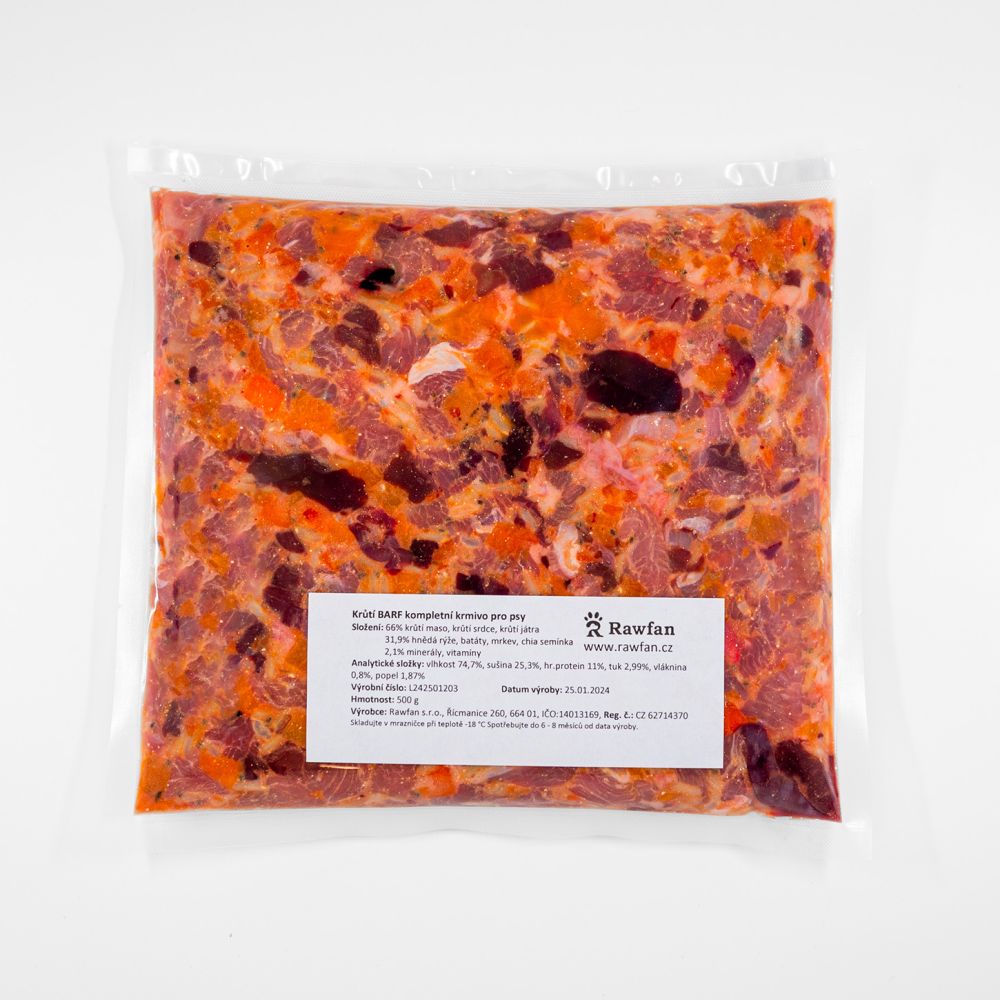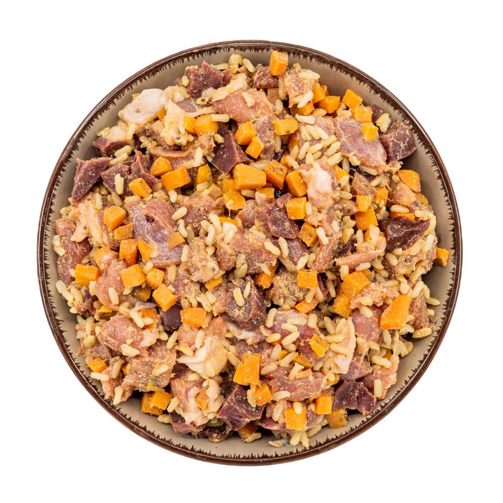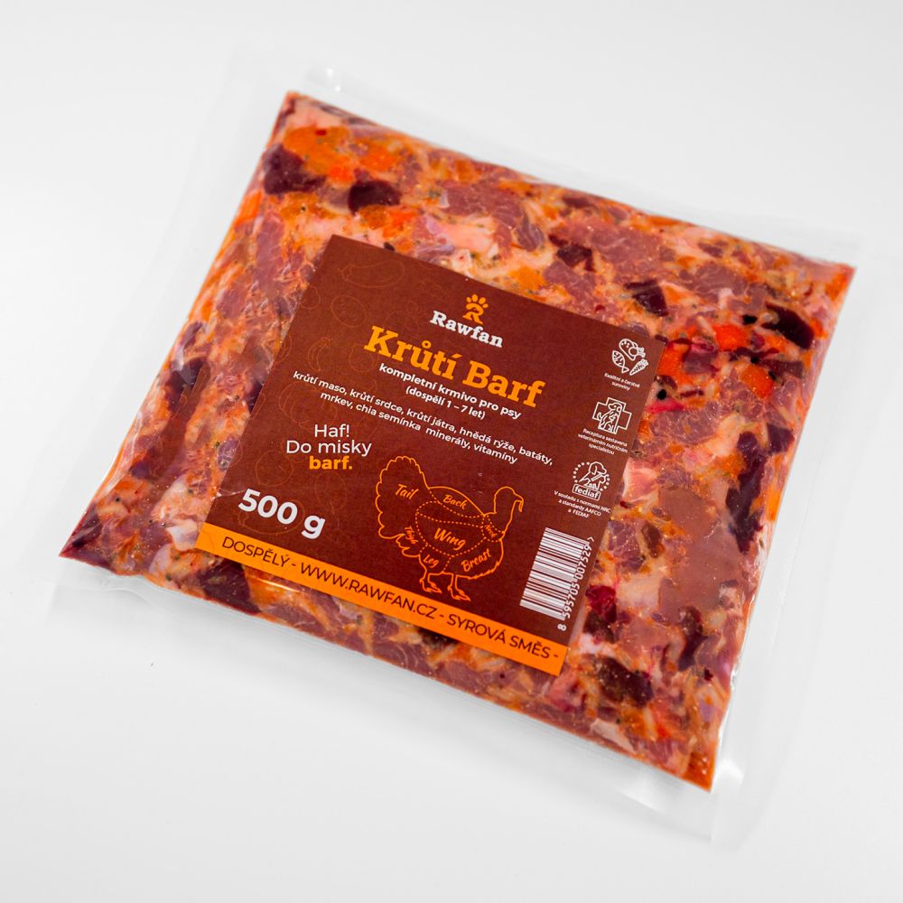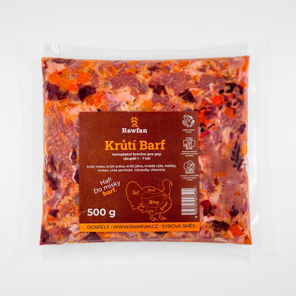 Krůtí směs je vyrobena z čerstvého krůtího masa, krůtích srdcí a jater, hnědé rýže, batátů, mrkve, chia semínek a rybího oleje, doplněné o potřebné vitamíny a minerální látky, pro podporu kostí, zubů, svalů, zdravou srst a pro správné fungování organismu.
