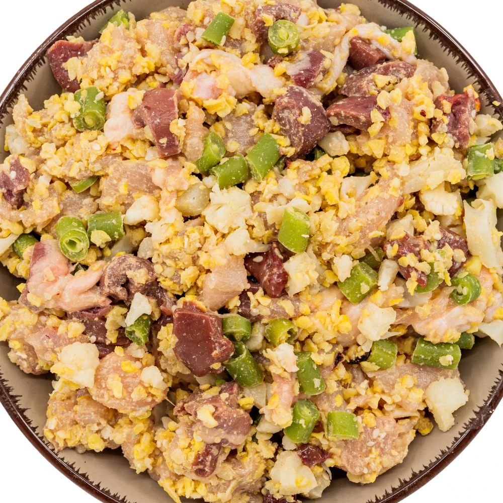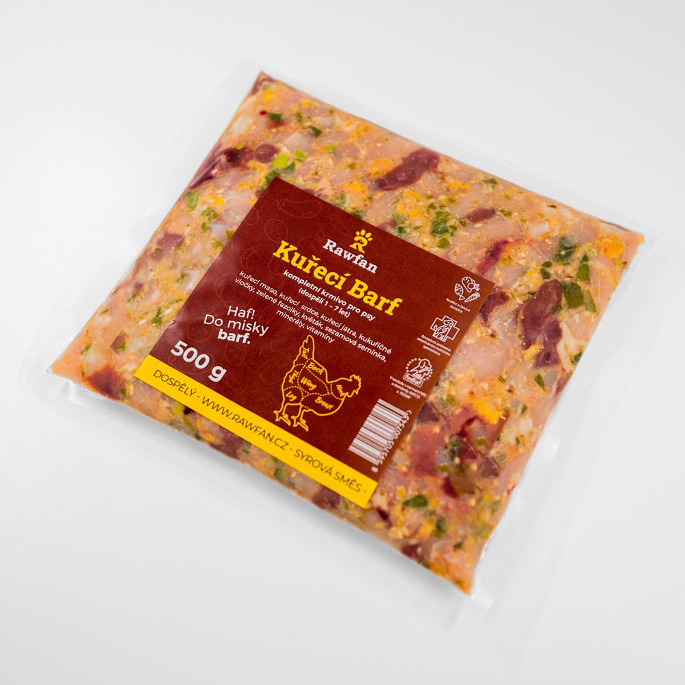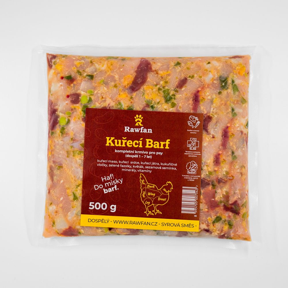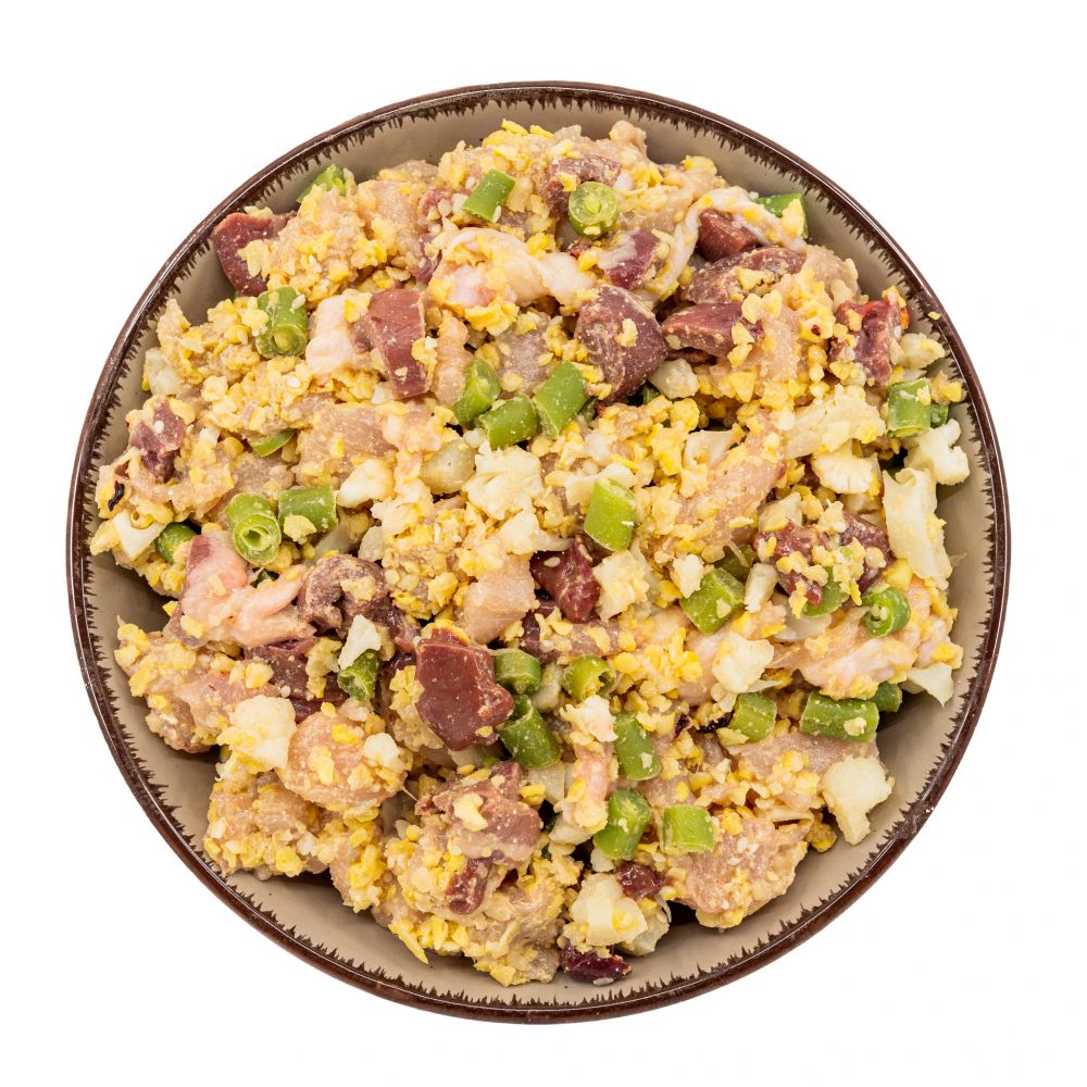 Kuřecí směs je vyrobena z čerstvého kuřecího masa, kuřecích srdcí a jater, kukuřičných vloček, zelených fazolek, květáku, sezamových semínek a rybího oleje, doplněné o potřebné vitamíny a minerální látky, pro podporu kostí, zubů, svalů, zdravou srst a pro správné fungování organismu.