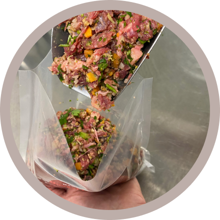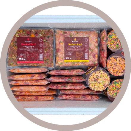 Základem přípravy kvalitní stravy jsou především kvalitní suroviny a jejich složení v optimálních poměrech. BARF je pečlivě připravován z prvotřídní svaloviny a vnitřností, výživných příloh, čerstvé zeleniny, bylinek, semínek nebo také olejů bohatých na omega 3 a 6 mastné kyseliny. Nechybí ani důležité vitaminy a minerální látky, které jsou nezbytné pro zdravou a vyváženou stravu. Jedná se vysoce kvalitní kompletní krmivo, které již není třeba ničím doplňovat. Vybrat si můžete také některé z našich hotových kompletů.