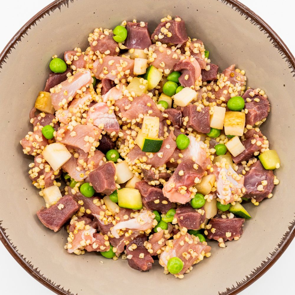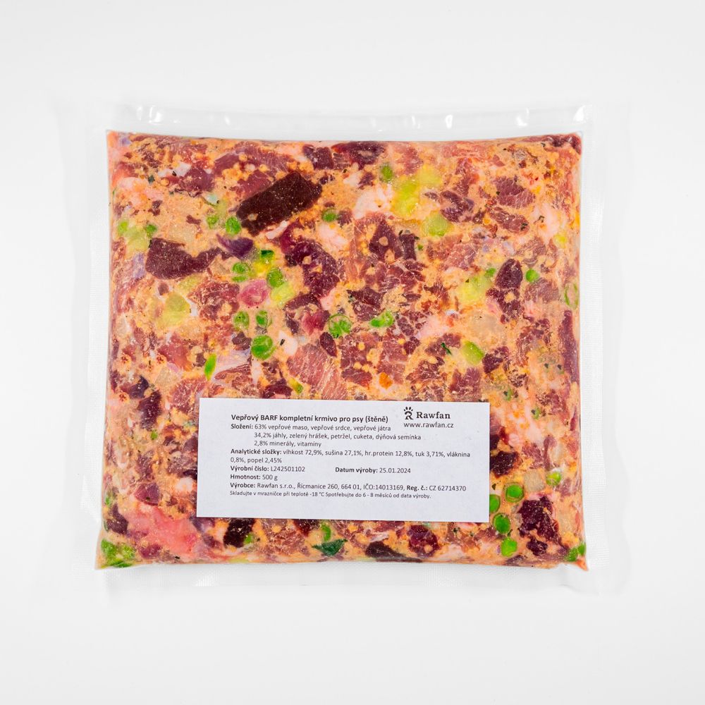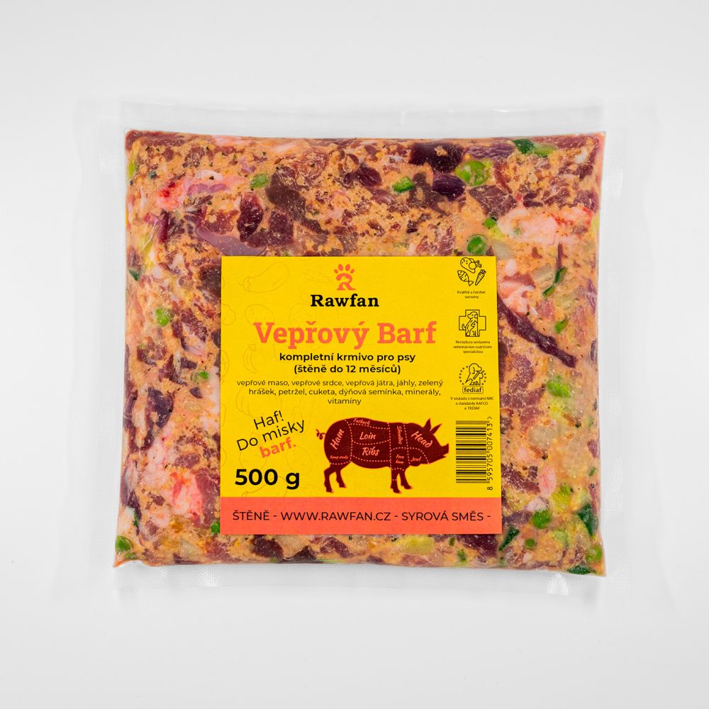Vepřová směs pro štěňata je vyrobena z čerstvého vepřového masa, vepřových srdcí a jater, jáhel, zeleného hrášku, kořenové petržele, cukety, dýňových semínek a rybího oleje, doplněné o potřebné vitamíny a minerální látky, které podporují růst kostry, pevné zuby, růst tkání, zdravou srst a zdravý vývoj organismu.