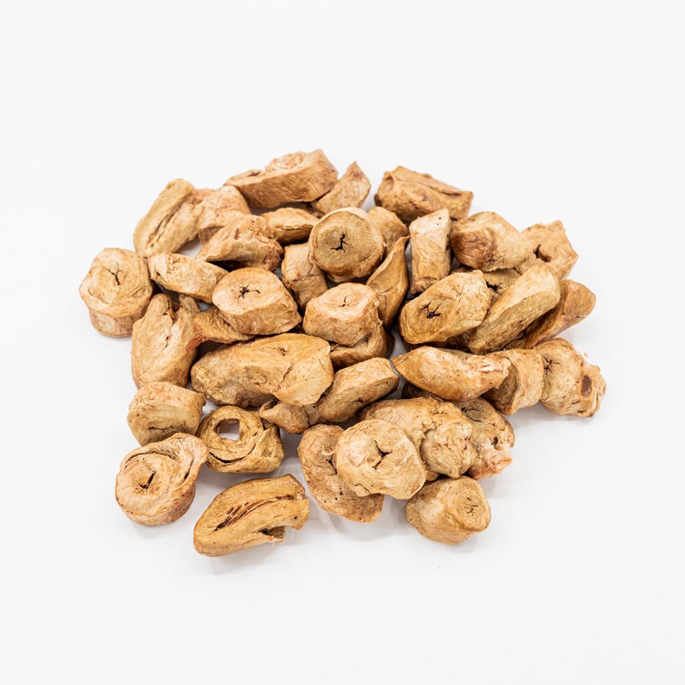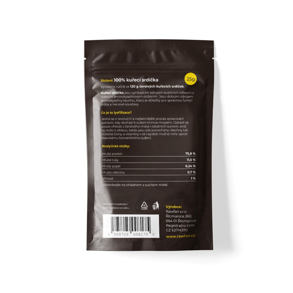 K výrobě 25 g lyofilizovaných kuřecích srdcí bylo použito 120 g syrových kuřecích srdcí.